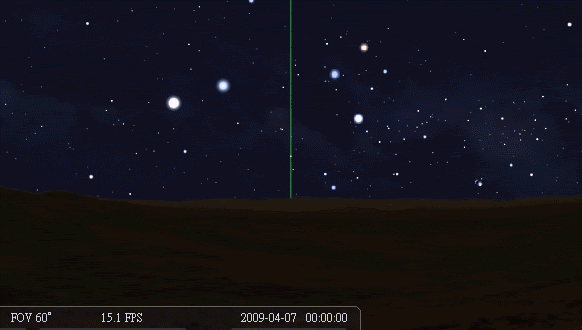 下方的動畫讓我們模擬一下實際星空所見的情況,中間綠色線為中天子午線,左側為南門二與馬腹一,右側為南十字座。